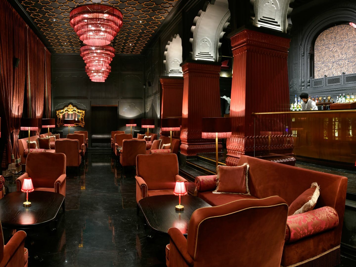At Patiala Bar, sip signature cocktails under a pink-hued, tasseled chandelier.