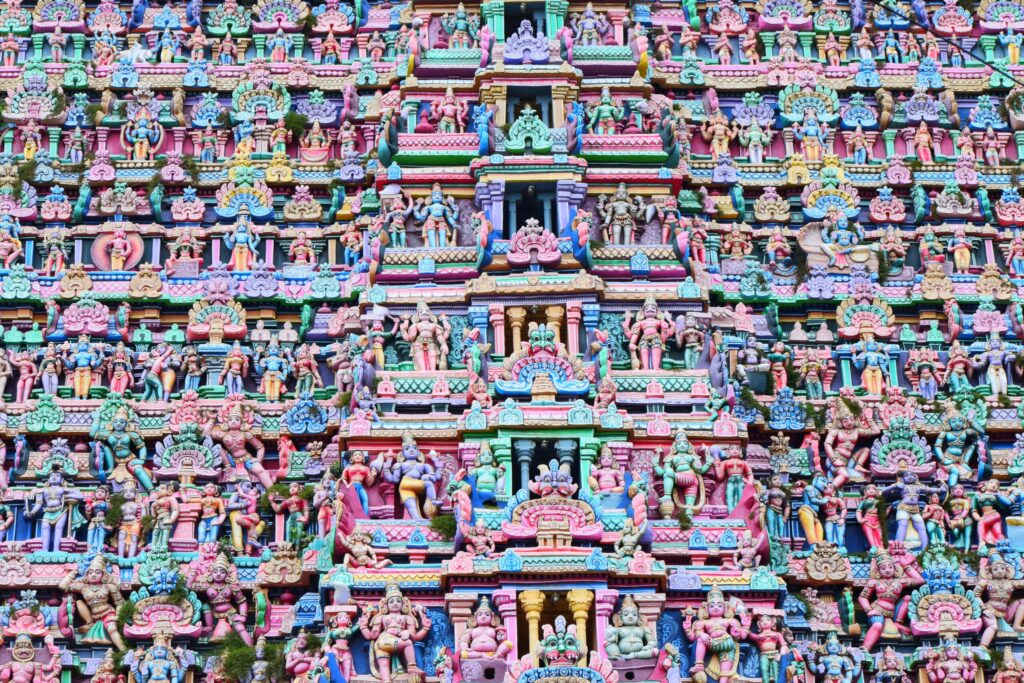 A detailed gopuram in Kumbakonam, the temple town in Tamil Nadu.