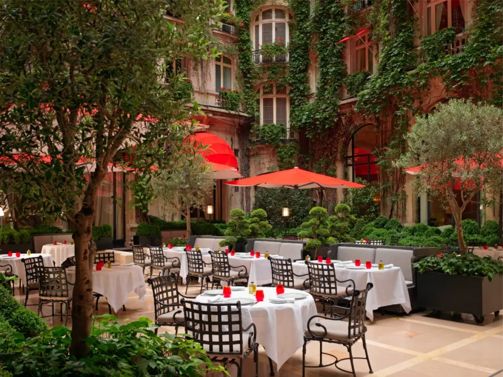 In the Galerie, gentle harp music is performed daily until 5 pm. Afternoon tea service by Angelo Musa is particularly celebrated for its artistic presentation. The Cour Jardin, enveloped by green walls and sheltered by the signature red parasols, is transformed seasonally, from summer restaurant to magical winter ice rink. The Bar, with its ceiling of blue volutes, houses rare Dom Pérignon bottles for the most discerning connoisseurs.